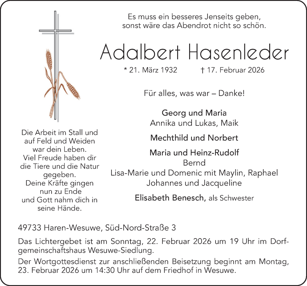 Hier finden Sie alle Traueranzeigen aus der Zeitung, die bisher für Adalbert Hasenleder erschienen sind. Weitere Traueranzeigen, die in der Zeitung erscheinen, werden hier ebenfalls aufgelistet