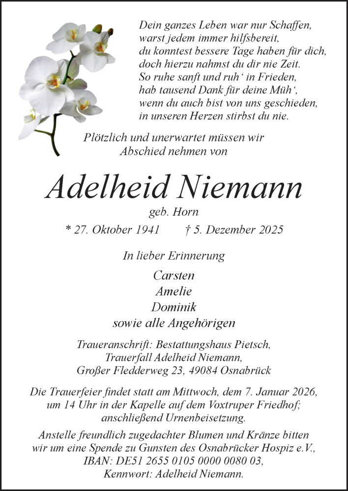 Hier finden Sie alle Traueranzeigen aus der Zeitung, die bisher für Adelheid Niemann erschienen sind. Weitere Traueranzeigen, die in der Zeitung erscheinen, werden hier ebenfalls aufgelistet