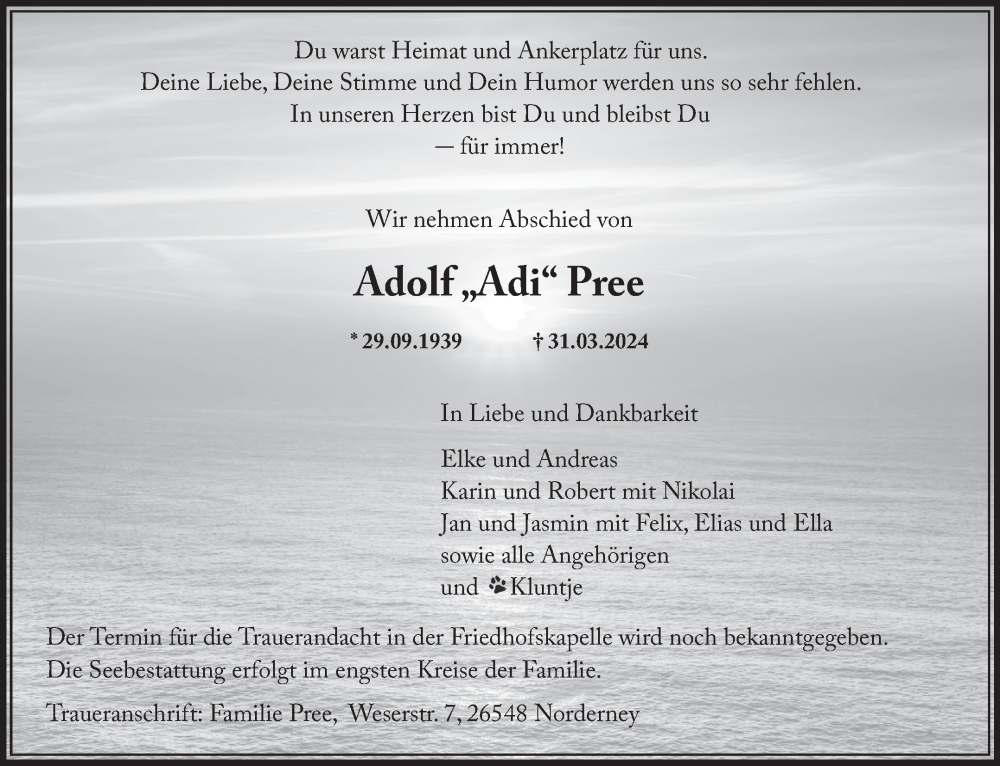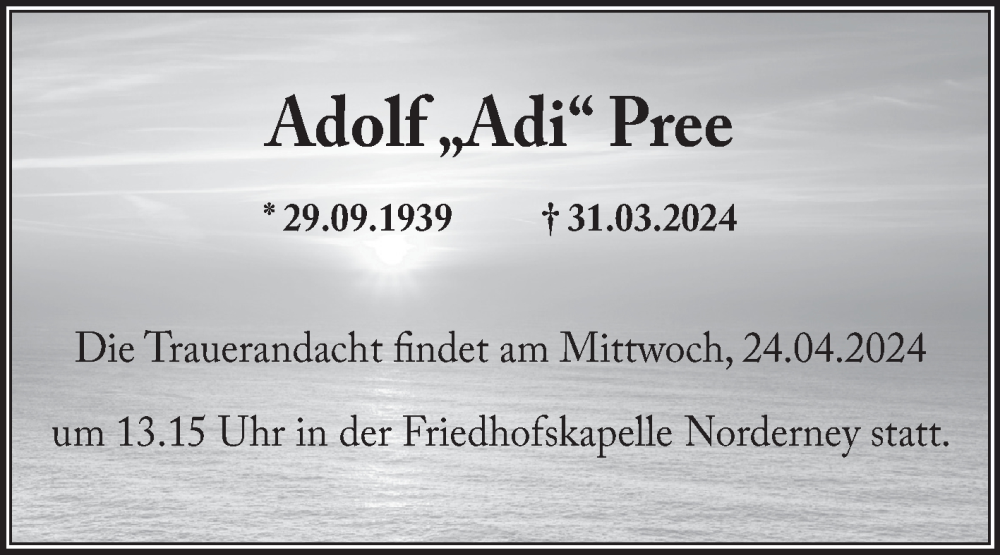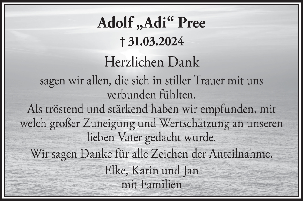 Hier finden Sie alle Traueranzeigen aus der Zeitung, die bisher für Adolf Pree erschienen sind. Weitere Traueranzeigen, die in der Zeitung erscheinen, werden hier ebenfalls aufgelistet