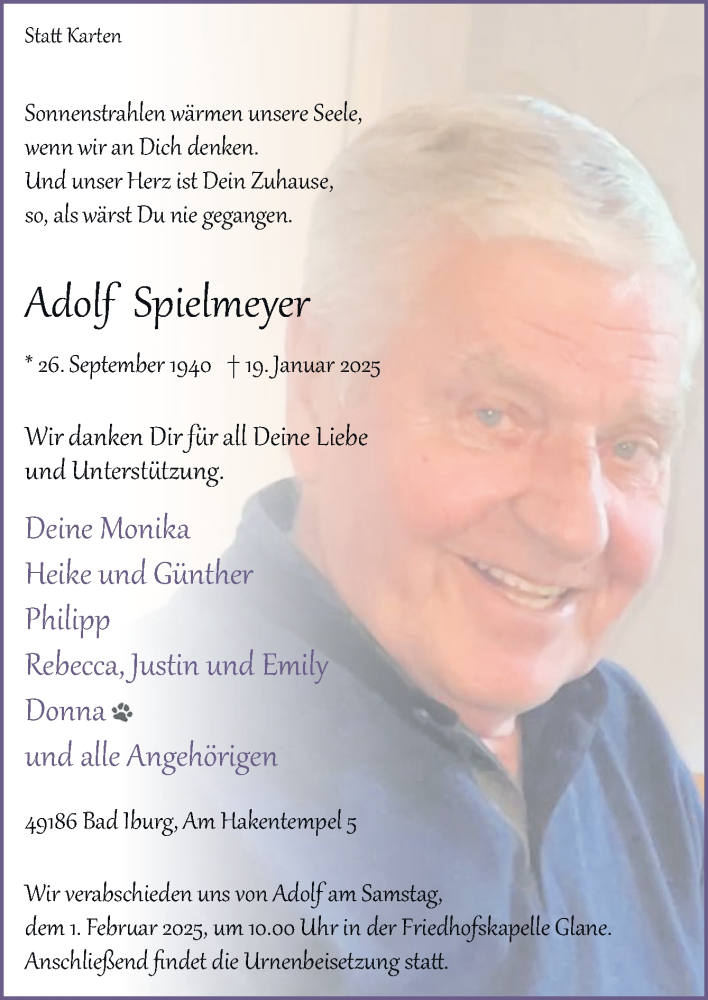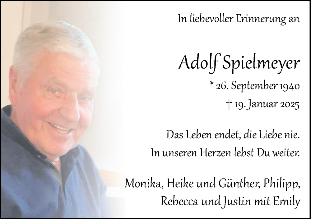 Hier finden Sie alle Traueranzeigen aus der Zeitung, die bisher für Adolf Spielmeyer erschienen sind. Weitere Traueranzeigen, die in der Zeitung erscheinen, werden hier ebenfalls aufgelistet