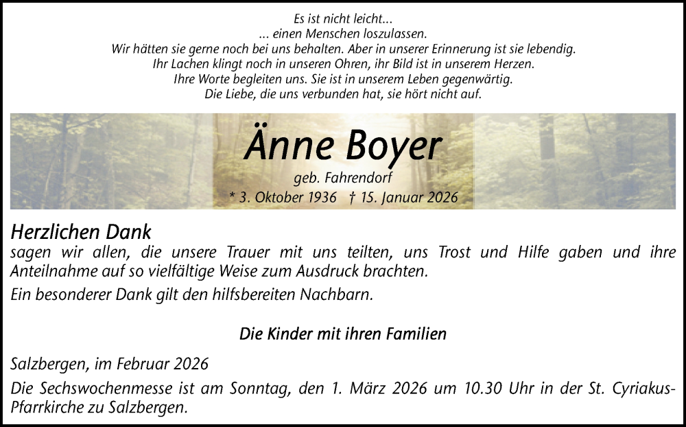 Hier finden Sie alle Traueranzeigen aus der Zeitung, die bisher für Änne Boyer erschienen sind. Weitere Traueranzeigen, die in der Zeitung erscheinen, werden hier ebenfalls aufgelistet