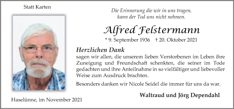 Hier finden Sie alle Traueranzeigen aus der Zeitung, die bisher für Afred Felstermann erschienen sind. Weitere Traueranzeigen, die in der Zeitung erscheinen, werden hier ebenfalls aufgelistet