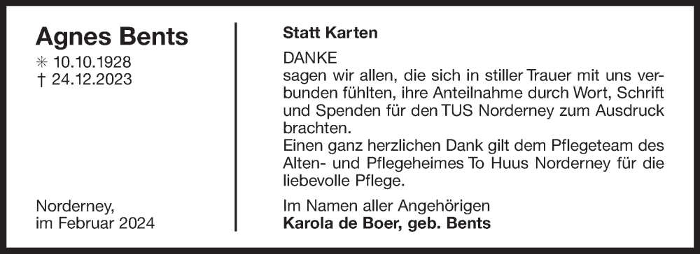 Hier finden Sie alle Traueranzeigen aus der Zeitung, die bisher für Agnes Bents erschienen sind. Weitere Traueranzeigen, die in der Zeitung erscheinen, werden hier ebenfalls aufgelistet