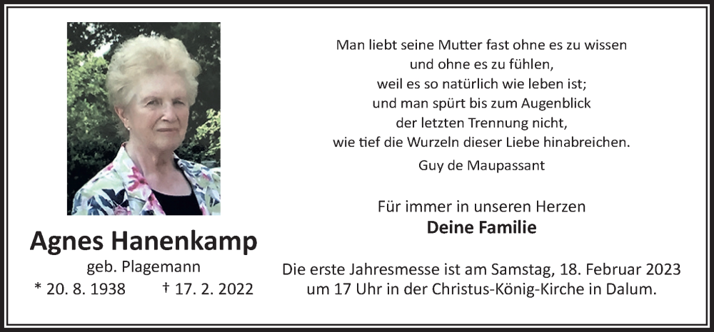 Hier finden Sie alle Traueranzeigen aus der Zeitung, die bisher für Agnes Hanenkamp erschienen sind. Weitere Traueranzeigen, die in der Zeitung erscheinen, werden hier ebenfalls aufgelistet