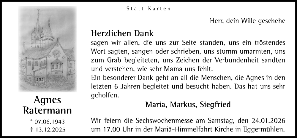Hier finden Sie alle Traueranzeigen aus der Zeitung, die bisher für Agnes Ratermann erschienen sind. Weitere Traueranzeigen, die in der Zeitung erscheinen, werden hier ebenfalls aufgelistet