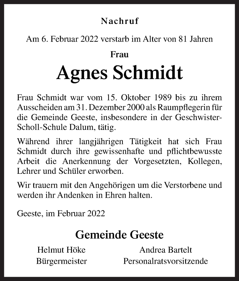 Hier finden Sie alle Traueranzeigen aus der Zeitung, die bisher für Agnes Schmidt erschienen sind. Weitere Traueranzeigen, die in der Zeitung erscheinen, werden hier ebenfalls aufgelistet