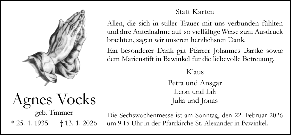 Hier finden Sie alle Traueranzeigen aus der Zeitung, die bisher für Agnes Vocks erschienen sind. Weitere Traueranzeigen, die in der Zeitung erscheinen, werden hier ebenfalls aufgelistet