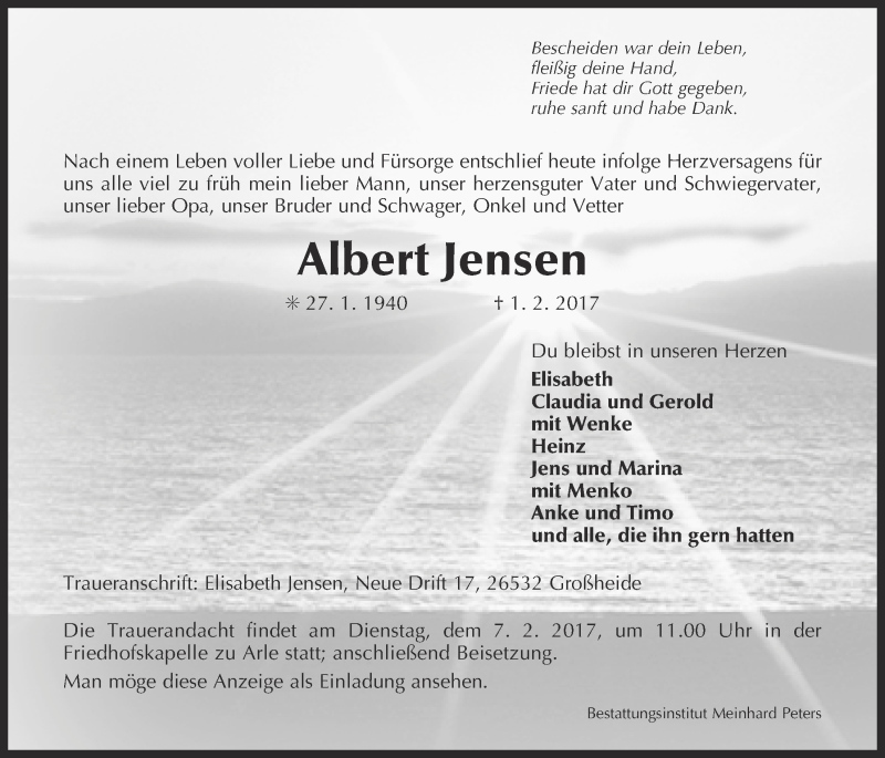 Hier finden Sie alle Traueranzeigen aus der Zeitung, die bisher für Albert Jensen erschienen sind. Weitere Traueranzeigen, die in der Zeitung erscheinen, werden hier ebenfalls aufgelistet