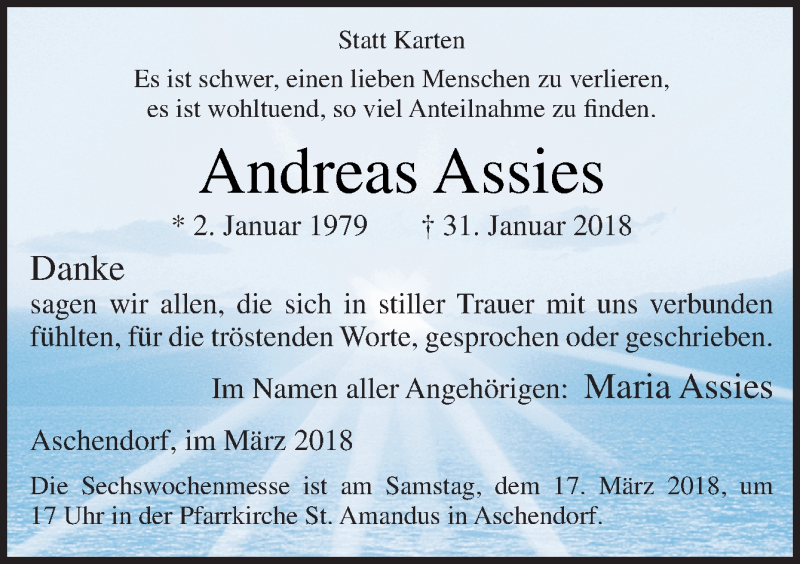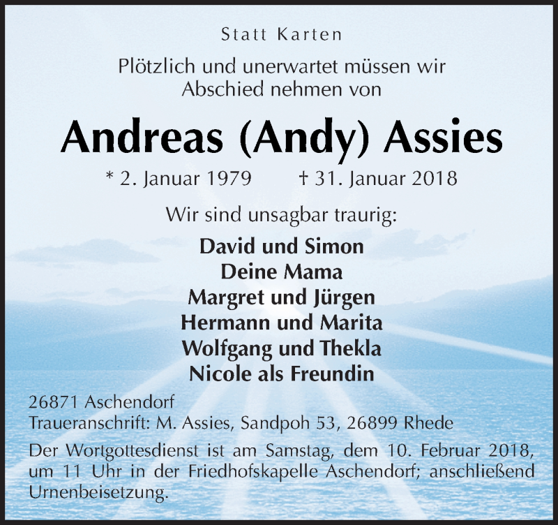 Hier finden Sie alle Traueranzeigen aus der Zeitung, die bisher für Andreas Assies erschienen sind. Weitere Traueranzeigen, die in der Zeitung erscheinen, werden hier ebenfalls aufgelistet
