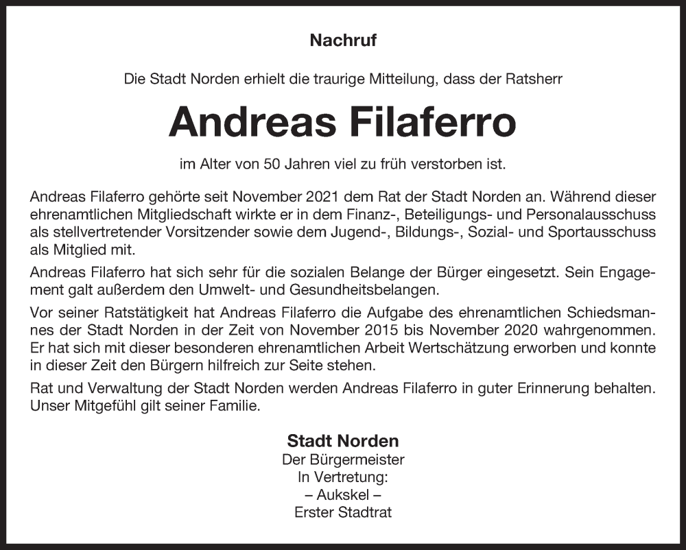 Hier finden Sie alle Traueranzeigen aus der Zeitung, die bisher für Andreas Filaferro erschienen sind. Weitere Traueranzeigen, die in der Zeitung erscheinen, werden hier ebenfalls aufgelistet