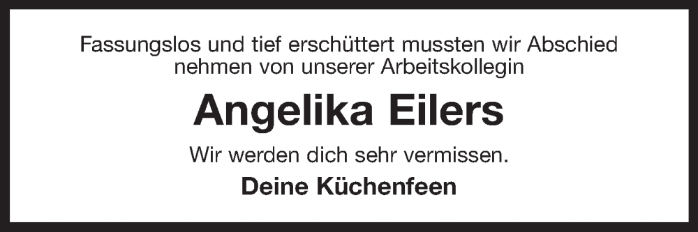 Hier finden Sie alle Traueranzeigen aus der Zeitung, die bisher für Angelika Eilers erschienen sind. Weitere Traueranzeigen, die in der Zeitung erscheinen, werden hier ebenfalls aufgelistet