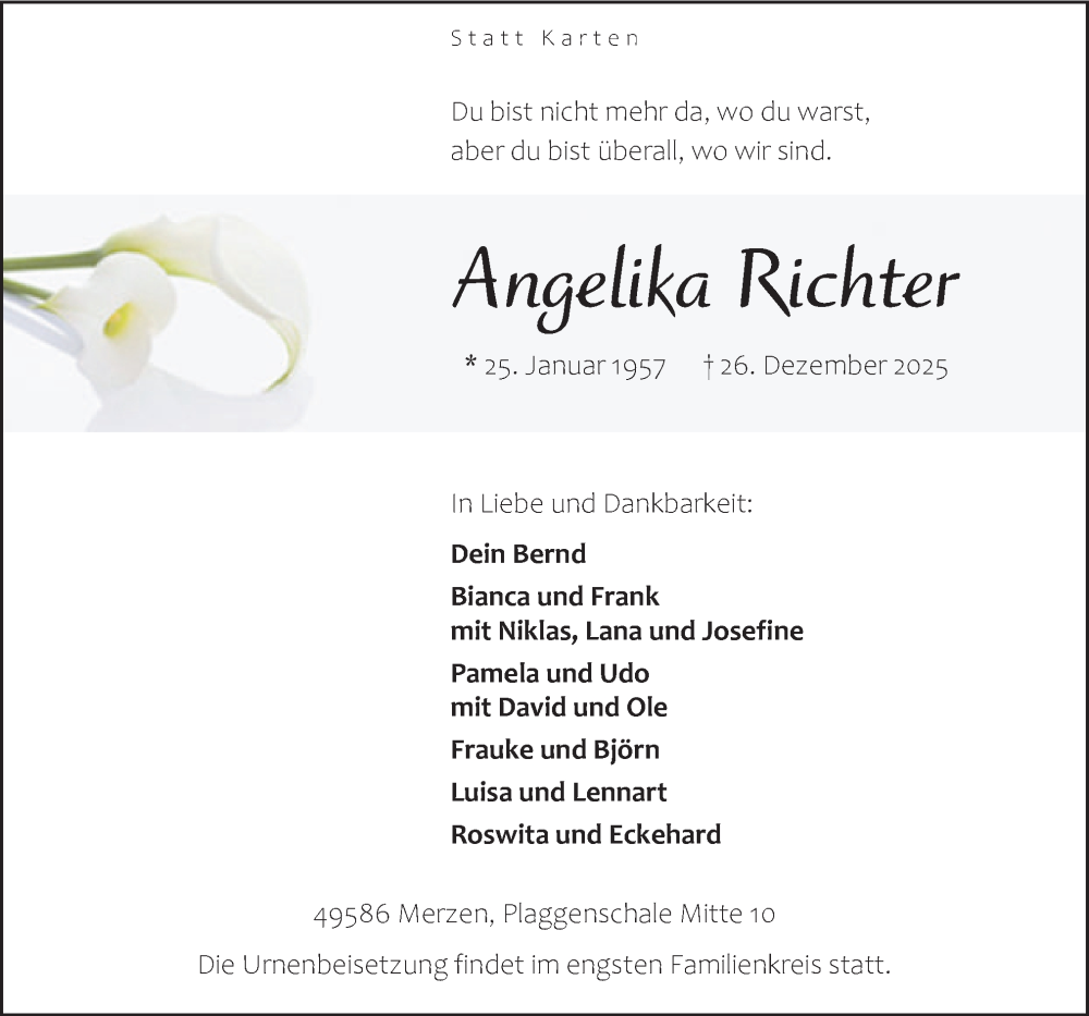 Hier finden Sie alle Traueranzeigen aus der Zeitung, die bisher für Angelika Richter erschienen sind. Weitere Traueranzeigen, die in der Zeitung erscheinen, werden hier ebenfalls aufgelistet