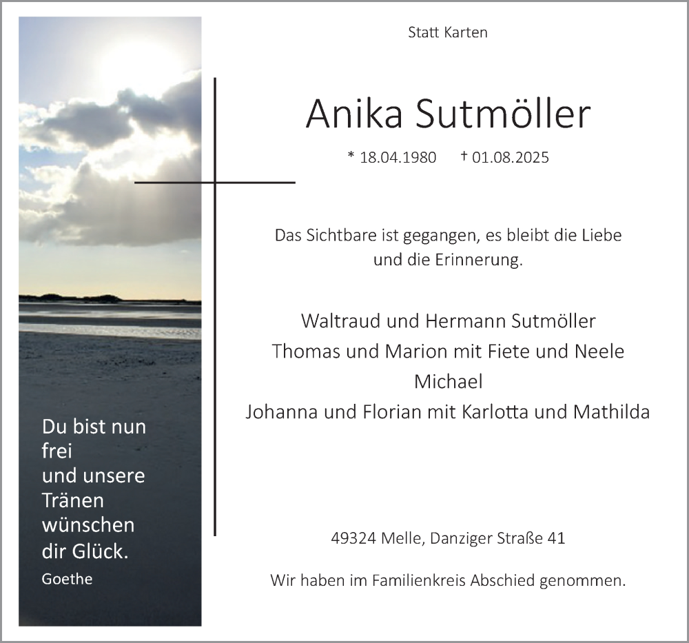 Hier finden Sie alle Traueranzeigen aus der Zeitung, die bisher für Anika Sutmöller erschienen sind. Weitere Traueranzeigen, die in der Zeitung erscheinen, werden hier ebenfalls aufgelistet