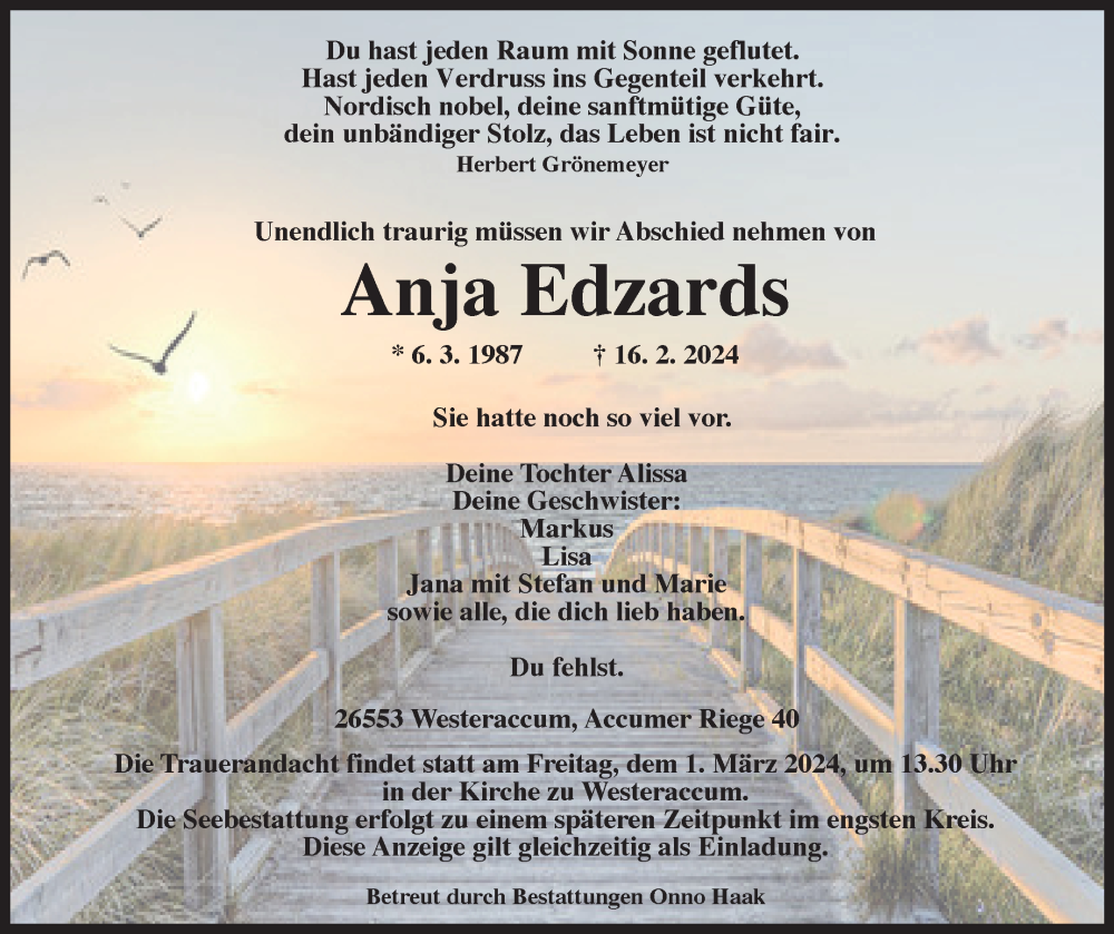 Hier finden Sie alle Traueranzeigen aus der Zeitung, die bisher für Anja Edzards erschienen sind. Weitere Traueranzeigen, die in der Zeitung erscheinen, werden hier ebenfalls aufgelistet