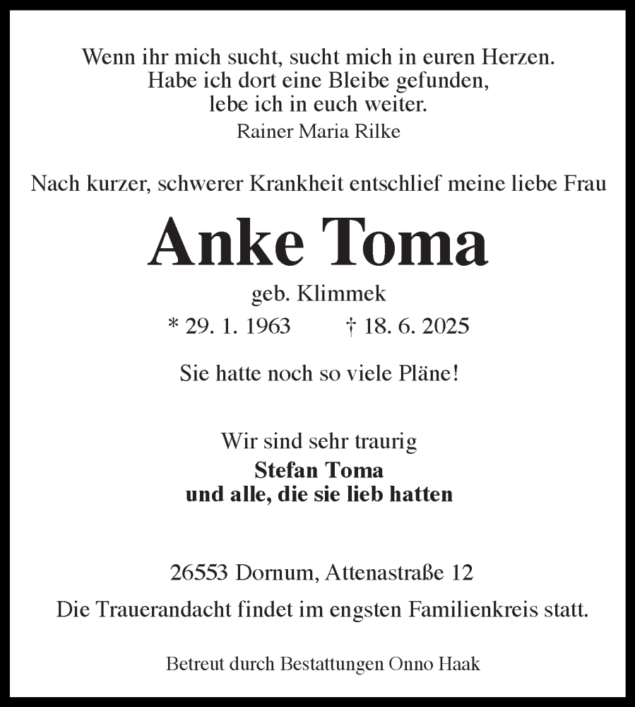 Hier finden Sie alle Traueranzeigen aus der Zeitung, die bisher für Anke Toma erschienen sind. Weitere Traueranzeigen, die in der Zeitung erscheinen, werden hier ebenfalls aufgelistet