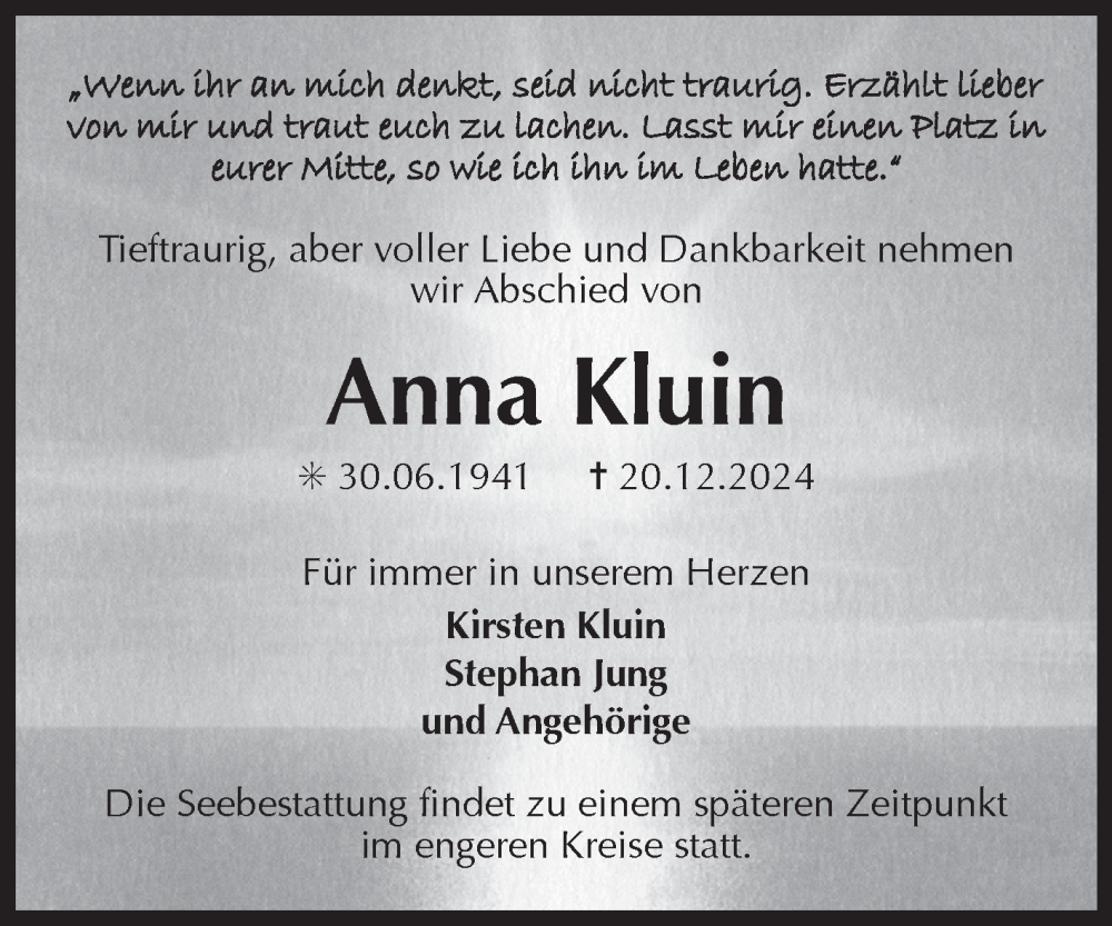 Hier finden Sie alle Traueranzeigen aus der Zeitung, die bisher für Anna Kluin erschienen sind. Weitere Traueranzeigen, die in der Zeitung erscheinen, werden hier ebenfalls aufgelistet