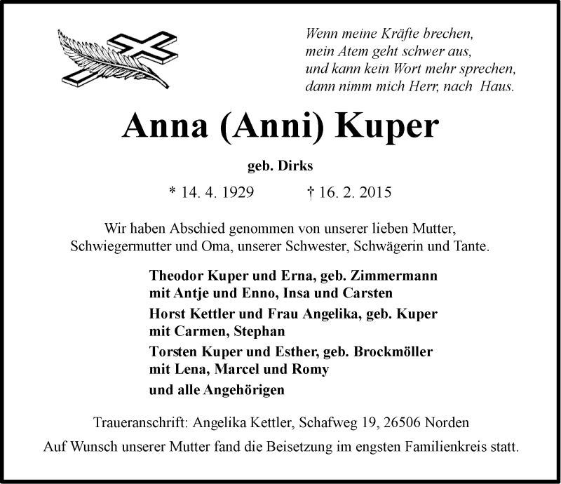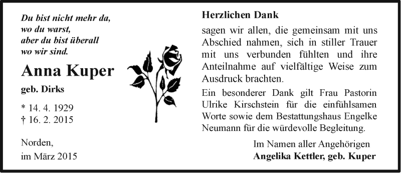 Hier finden Sie alle Traueranzeigen aus der Zeitung, die bisher für Anna Kuper erschienen sind. Weitere Traueranzeigen, die in der Zeitung erscheinen, werden hier ebenfalls aufgelistet