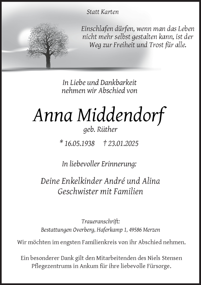 Hier finden Sie alle Traueranzeigen aus der Zeitung, die bisher für Anna Middendorf erschienen sind. Weitere Traueranzeigen, die in der Zeitung erscheinen, werden hier ebenfalls aufgelistet