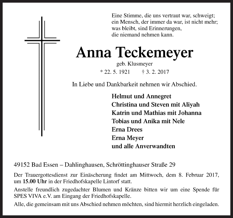 Hier finden Sie alle Traueranzeigen aus der Zeitung, die bisher für Anna Teckemeyer erschienen sind. Weitere Traueranzeigen, die in der Zeitung erscheinen, werden hier ebenfalls aufgelistet