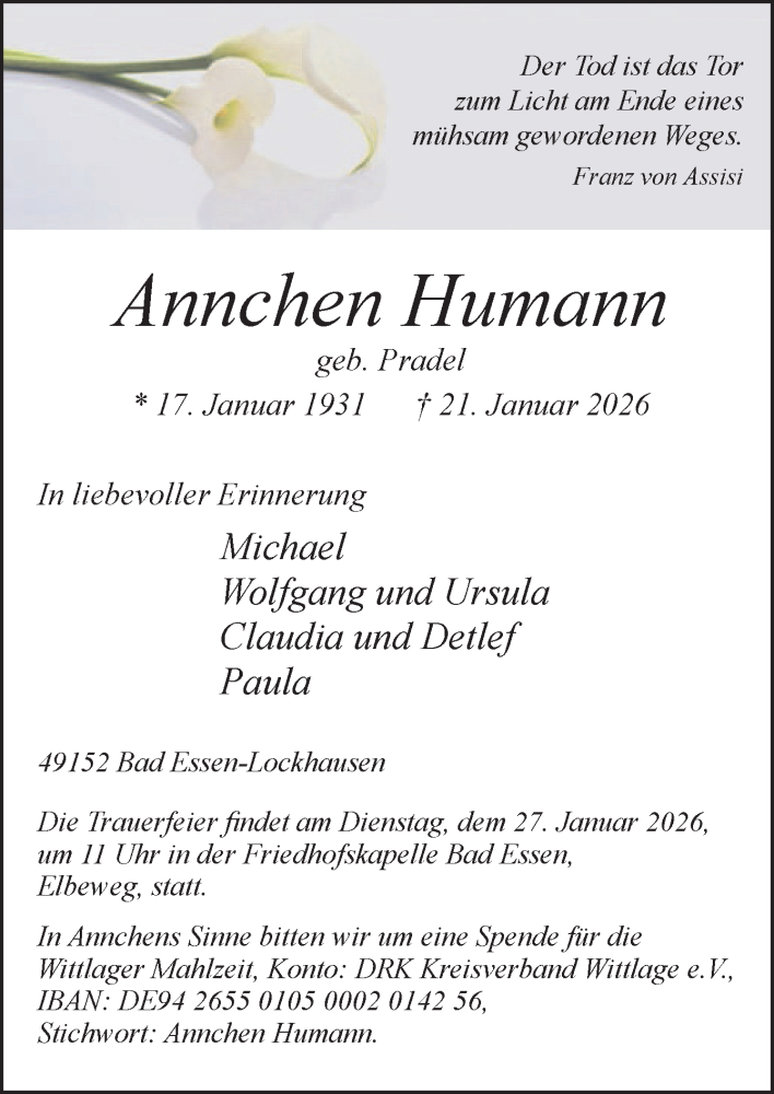 Hier finden Sie alle Traueranzeigen aus der Zeitung, die bisher für Annchen Humann erschienen sind. Weitere Traueranzeigen, die in der Zeitung erscheinen, werden hier ebenfalls aufgelistet