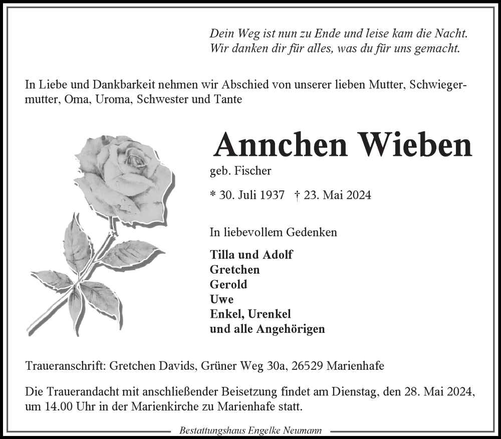 Hier finden Sie alle Traueranzeigen aus der Zeitung, die bisher für Annchen Wieben erschienen sind. Weitere Traueranzeigen, die in der Zeitung erscheinen, werden hier ebenfalls aufgelistet