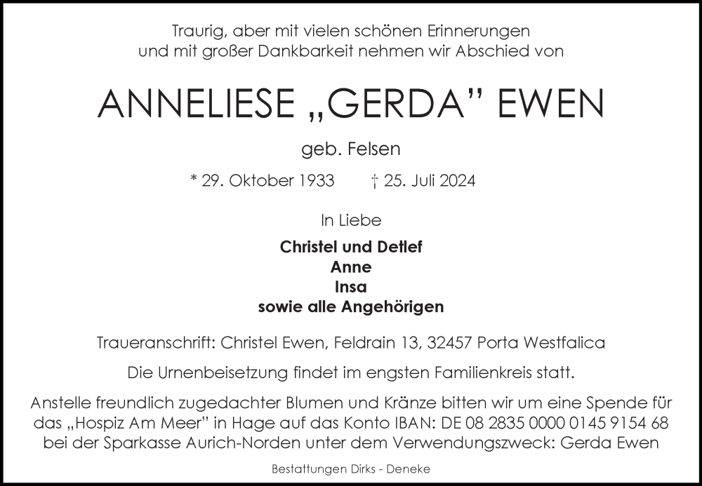 Hier finden Sie alle Traueranzeigen aus der Zeitung, die bisher für Anneliese Ewen erschienen sind. Weitere Traueranzeigen, die in der Zeitung erscheinen, werden hier ebenfalls aufgelistet