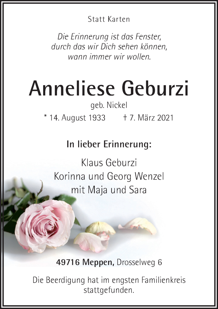 Hier finden Sie alle Traueranzeigen aus der Zeitung, die bisher für Anneliese Geburzi erschienen sind. Weitere Traueranzeigen, die in der Zeitung erscheinen, werden hier ebenfalls aufgelistet