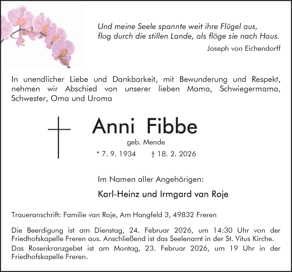 Hier finden Sie alle Traueranzeigen aus der Zeitung, die bisher für Anni Fibbe erschienen sind. Weitere Traueranzeigen, die in der Zeitung erscheinen, werden hier ebenfalls aufgelistet