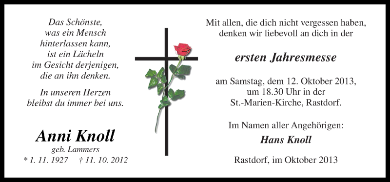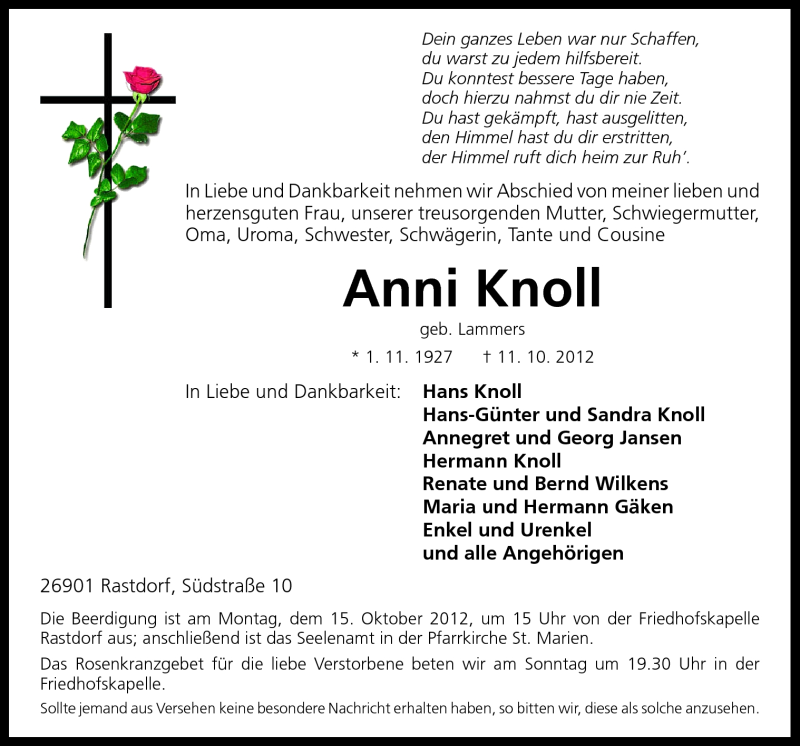 Hier finden Sie alle Traueranzeigen aus der Zeitung, die bisher für Anni Knoll erschienen sind. Weitere Traueranzeigen, die in der Zeitung erscheinen, werden hier ebenfalls aufgelistet