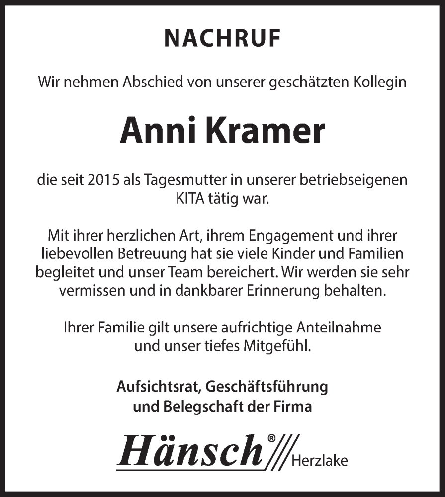 Hier finden Sie alle Traueranzeigen aus der Zeitung, die bisher für Anni Kramer erschienen sind. Weitere Traueranzeigen, die in der Zeitung erscheinen, werden hier ebenfalls aufgelistet