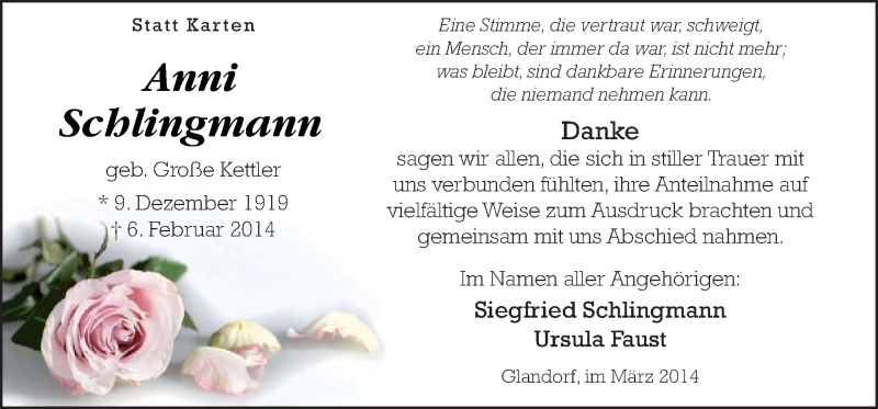 Hier finden Sie alle Traueranzeigen aus der Zeitung, die bisher für Anni Schlingmann erschienen sind. Weitere Traueranzeigen, die in der Zeitung erscheinen, werden hier ebenfalls aufgelistet