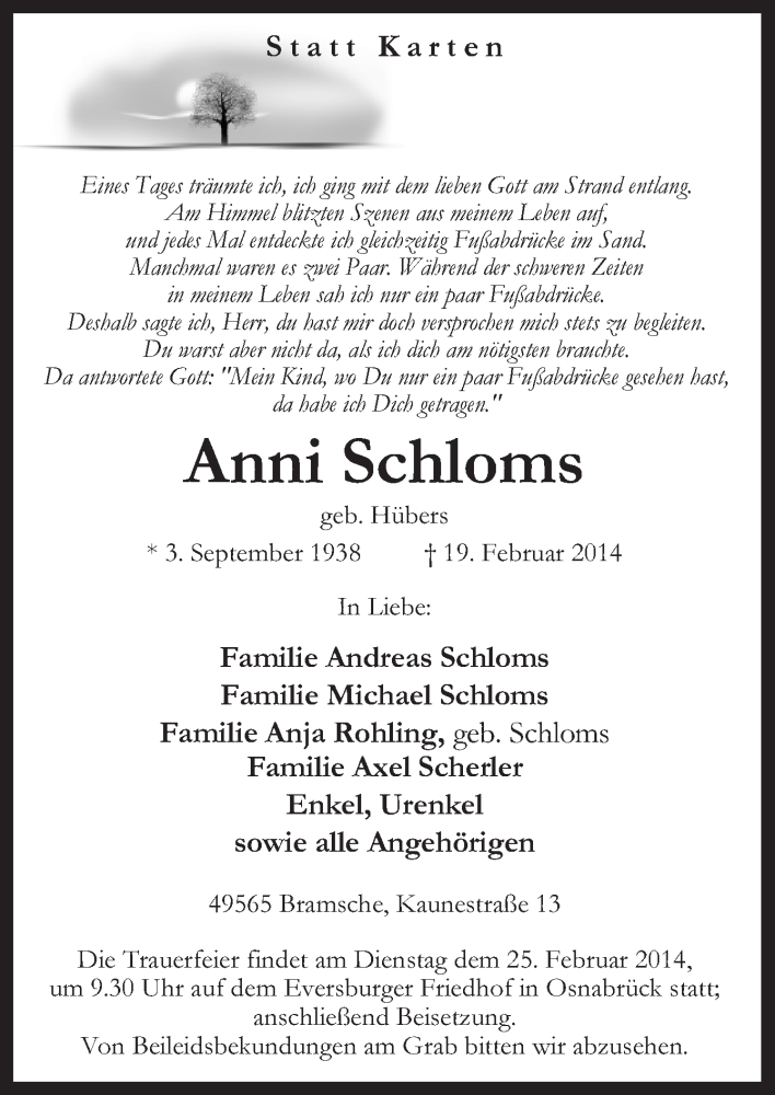 Hier finden Sie alle Traueranzeigen aus der Zeitung, die bisher für Anni Schloms erschienen sind. Weitere Traueranzeigen, die in der Zeitung erscheinen, werden hier ebenfalls aufgelistet