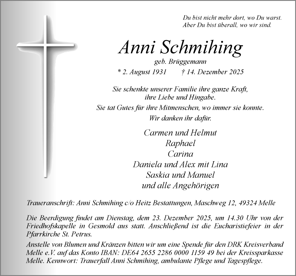 Hier finden Sie alle Traueranzeigen aus der Zeitung, die bisher für Anni Schmihing erschienen sind. Weitere Traueranzeigen, die in der Zeitung erscheinen, werden hier ebenfalls aufgelistet