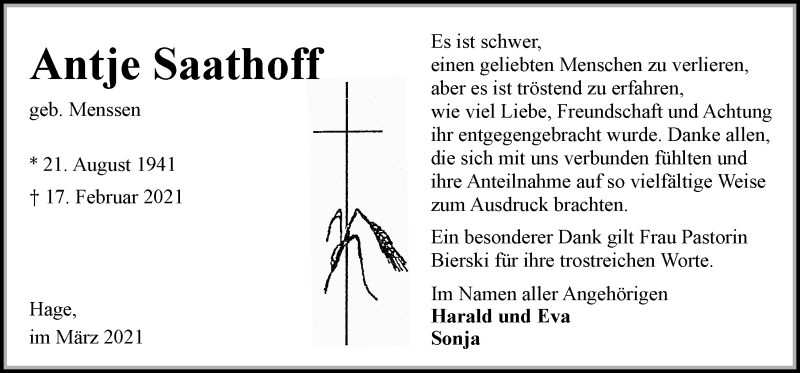 Hier finden Sie alle Traueranzeigen aus der Zeitung, die bisher für Antje Saathoff erschienen sind. Weitere Traueranzeigen, die in der Zeitung erscheinen, werden hier ebenfalls aufgelistet
