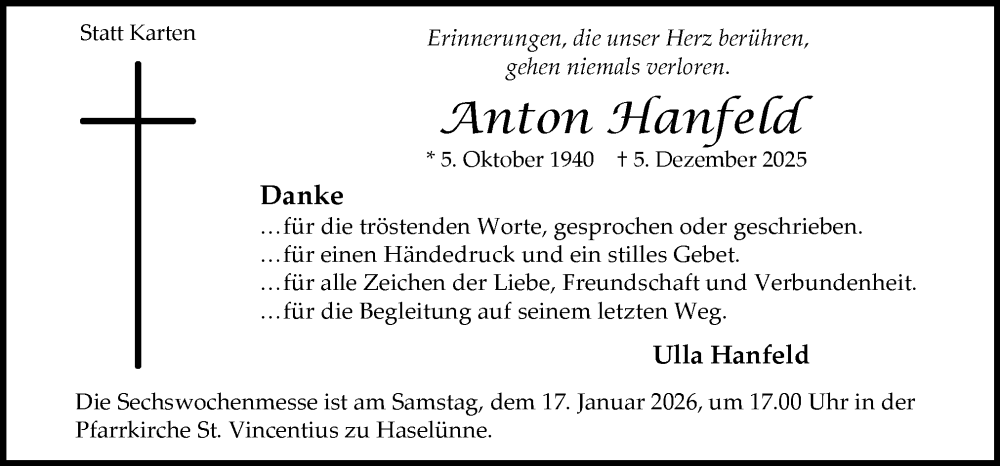 Hier finden Sie alle Traueranzeigen aus der Zeitung, die bisher für Anton Hanfeld erschienen sind. Weitere Traueranzeigen, die in der Zeitung erscheinen, werden hier ebenfalls aufgelistet