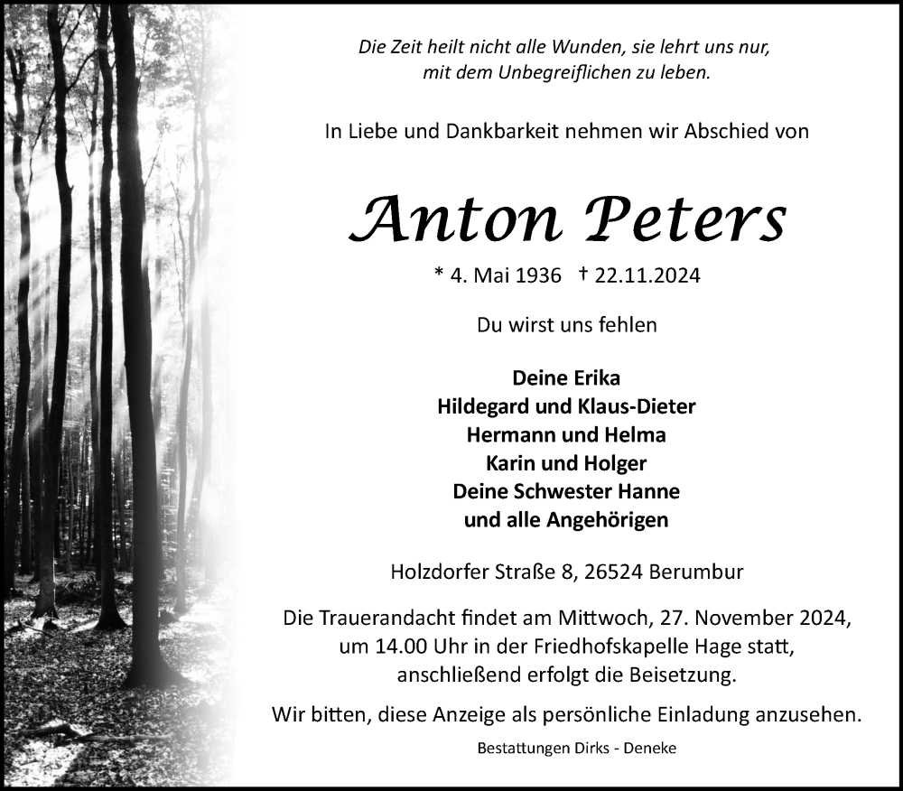Hier finden Sie alle Traueranzeigen aus der Zeitung, die bisher für Anton Peters erschienen sind. Weitere Traueranzeigen, die in der Zeitung erscheinen, werden hier ebenfalls aufgelistet