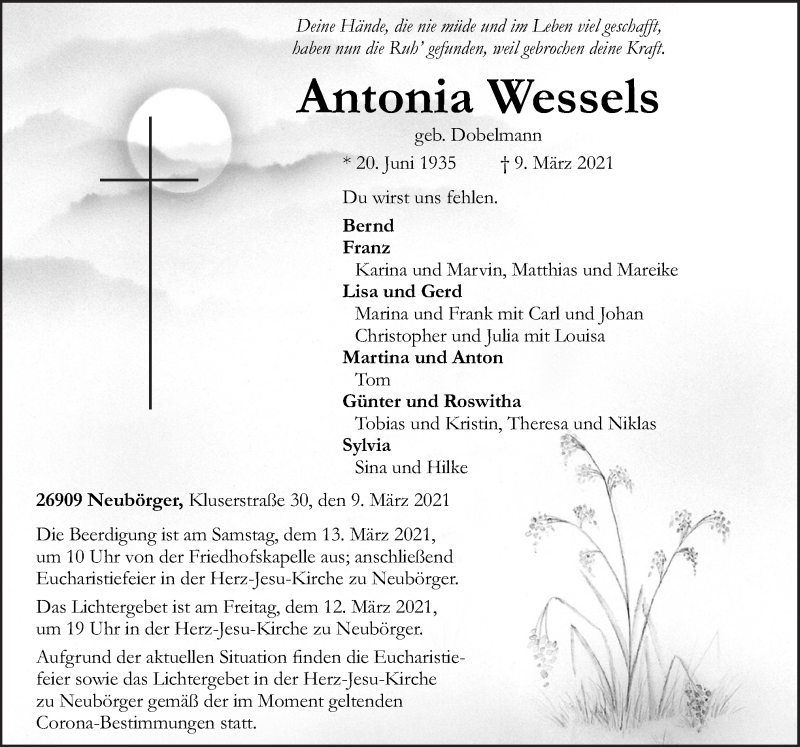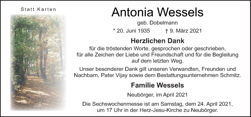 Hier finden Sie alle Traueranzeigen aus der Zeitung, die bisher für Antonia Wessels erschienen sind. Weitere Traueranzeigen, die in der Zeitung erscheinen, werden hier ebenfalls aufgelistet