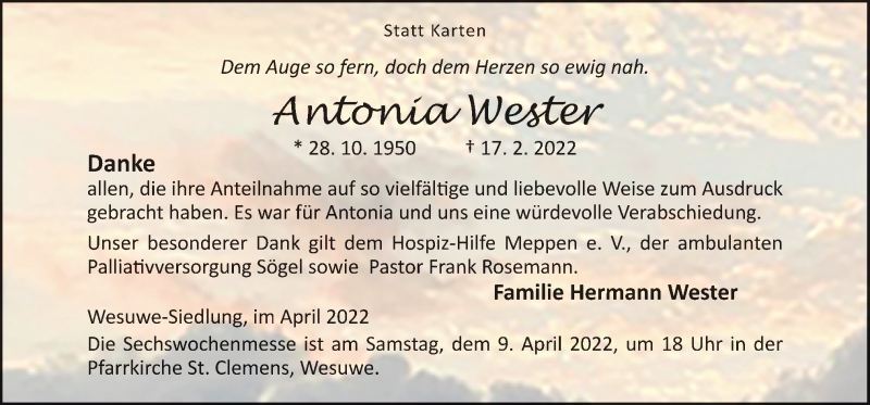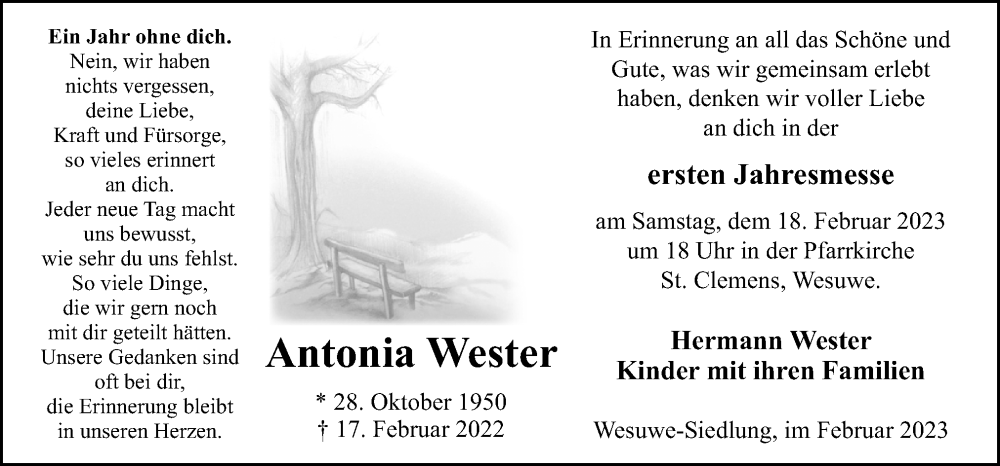 Hier finden Sie alle Traueranzeigen aus der Zeitung, die bisher für Antonia Wester erschienen sind. Weitere Traueranzeigen, die in der Zeitung erscheinen, werden hier ebenfalls aufgelistet