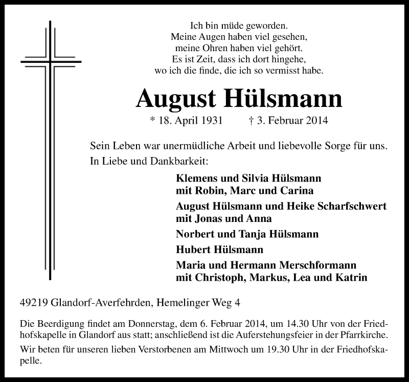 Hier finden Sie alle Traueranzeigen aus der Zeitung, die bisher für August Hülsmann erschienen sind. Weitere Traueranzeigen, die in der Zeitung erscheinen, werden hier ebenfalls aufgelistet