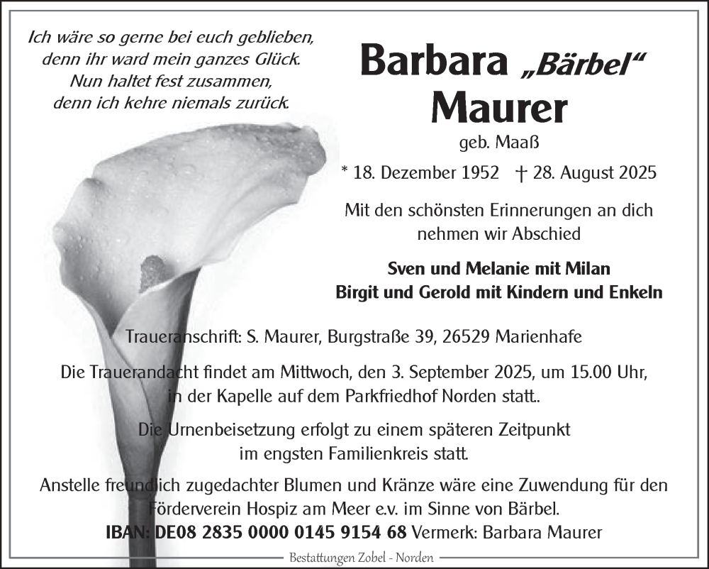 Hier finden Sie alle Traueranzeigen aus der Zeitung, die bisher für Barbara Maurer erschienen sind. Weitere Traueranzeigen, die in der Zeitung erscheinen, werden hier ebenfalls aufgelistet