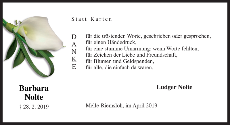 Hier finden Sie alle Traueranzeigen aus der Zeitung, die bisher für Barbara Nolte erschienen sind. Weitere Traueranzeigen, die in der Zeitung erscheinen, werden hier ebenfalls aufgelistet