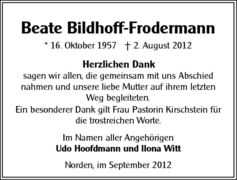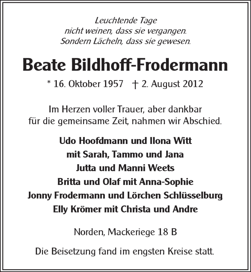 Hier finden Sie alle Traueranzeigen aus der Zeitung, die bisher für Beate Bildhoff-Frodermann erschienen sind. Weitere Traueranzeigen, die in der Zeitung erscheinen, werden hier ebenfalls aufgelistet