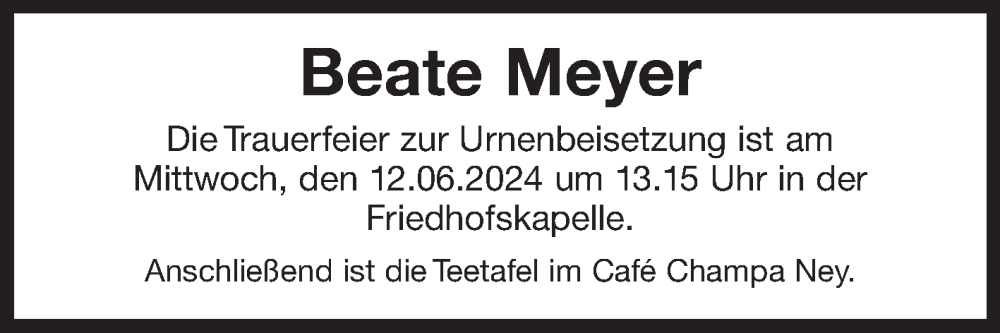 Hier finden Sie alle Traueranzeigen aus der Zeitung, die bisher für Beate Meyer erschienen sind. Weitere Traueranzeigen, die in der Zeitung erscheinen, werden hier ebenfalls aufgelistet