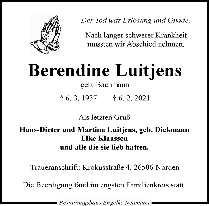 Hier finden Sie alle Traueranzeigen aus der Zeitung, die bisher für Berendine Luitjens erschienen sind. Weitere Traueranzeigen, die in der Zeitung erscheinen, werden hier ebenfalls aufgelistet