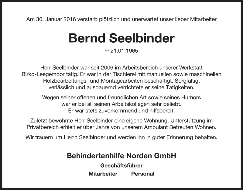 Hier finden Sie alle Traueranzeigen aus der Zeitung, die bisher für Bernd Seelbinder erschienen sind. Weitere Traueranzeigen, die in der Zeitung erscheinen, werden hier ebenfalls aufgelistet