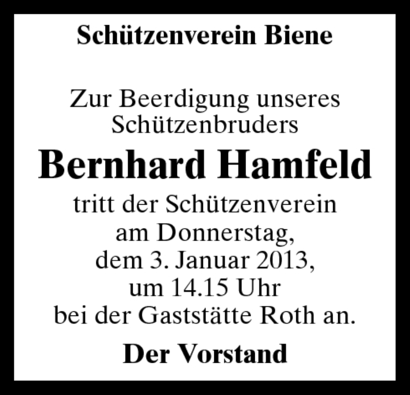 Hier finden Sie alle Traueranzeigen aus der Zeitung, die bisher für Bernhard Hamfeld erschienen sind. Weitere Traueranzeigen, die in der Zeitung erscheinen, werden hier ebenfalls aufgelistet