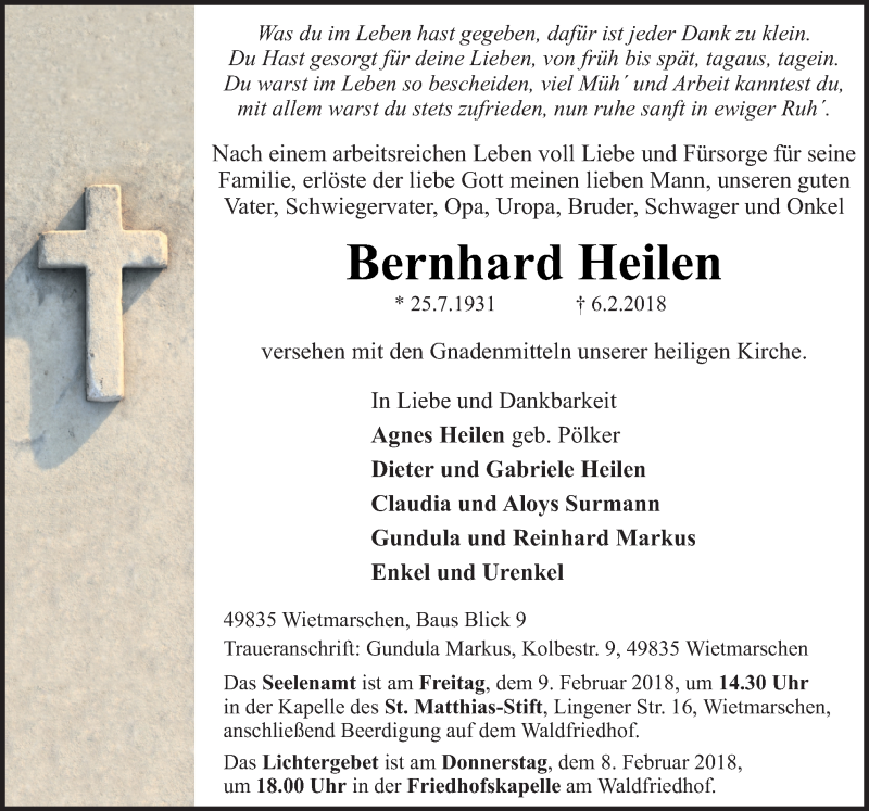 Hier finden Sie alle Traueranzeigen aus der Zeitung, die bisher für Bernhard Heilen erschienen sind. Weitere Traueranzeigen, die in der Zeitung erscheinen, werden hier ebenfalls aufgelistet