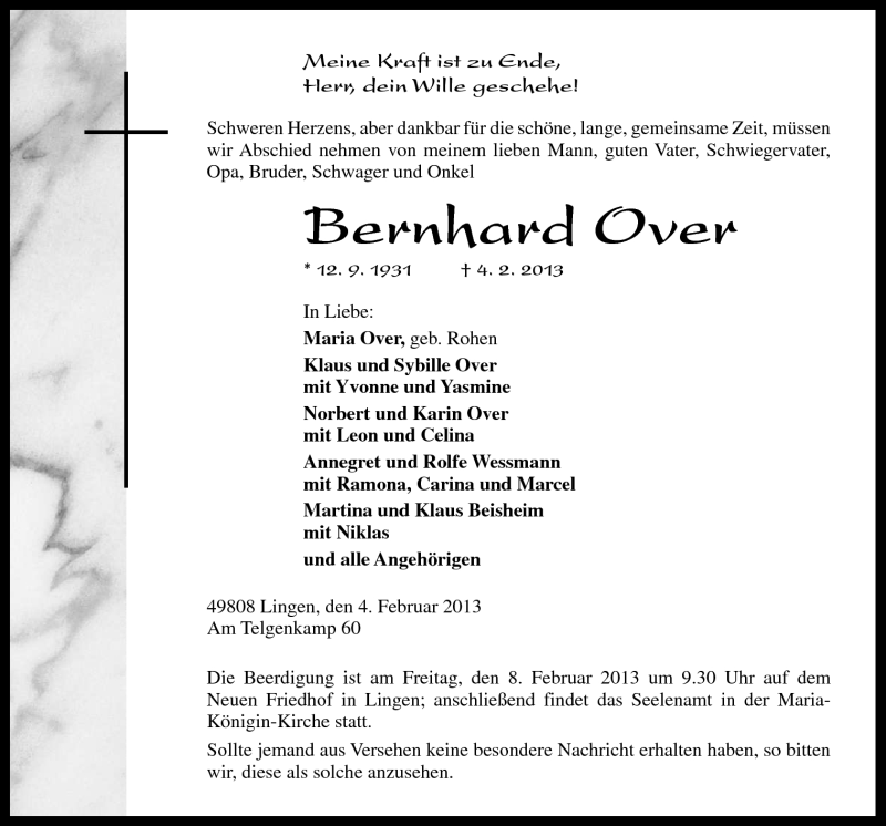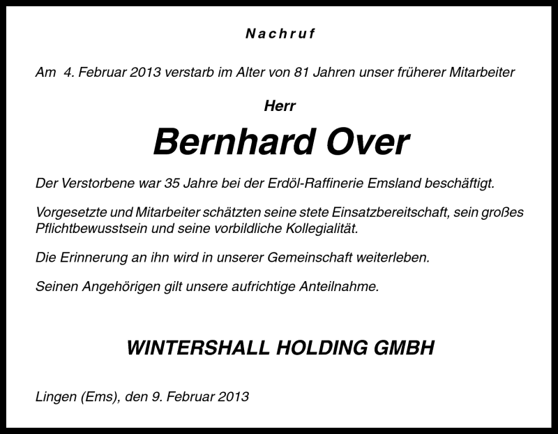 Hier finden Sie alle Traueranzeigen aus der Zeitung, die bisher für Bernhard Over erschienen sind. Weitere Traueranzeigen, die in der Zeitung erscheinen, werden hier ebenfalls aufgelistet