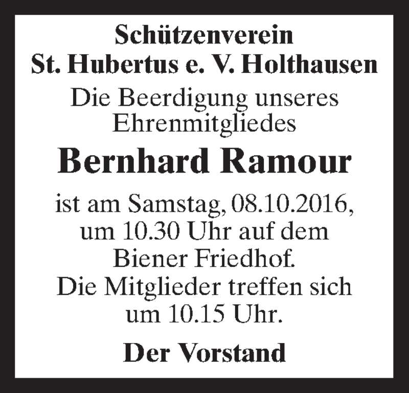 Hier finden Sie alle Traueranzeigen aus der Zeitung, die bisher für Bernhard Ramour erschienen sind. Weitere Traueranzeigen, die in der Zeitung erscheinen, werden hier ebenfalls aufgelistet
