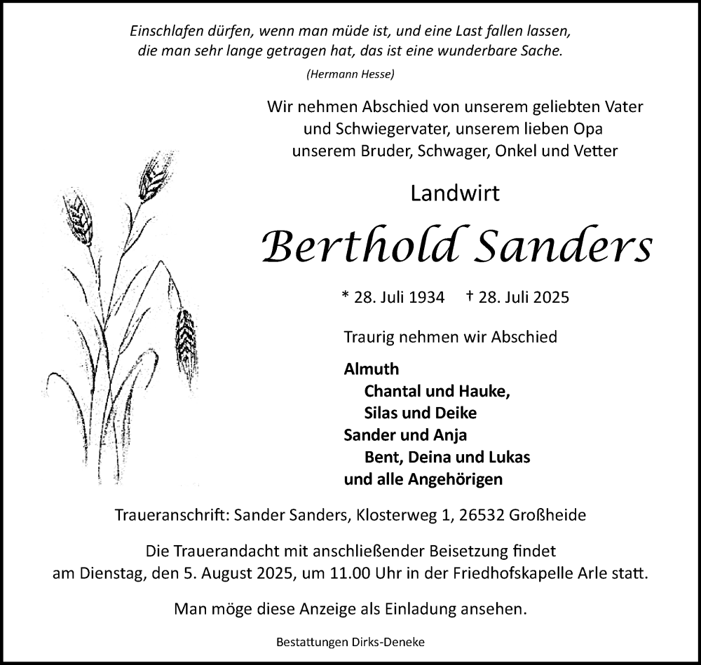 Hier finden Sie alle Traueranzeigen aus der Zeitung, die bisher für Berthold Sanders erschienen sind. Weitere Traueranzeigen, die in der Zeitung erscheinen, werden hier ebenfalls aufgelistet